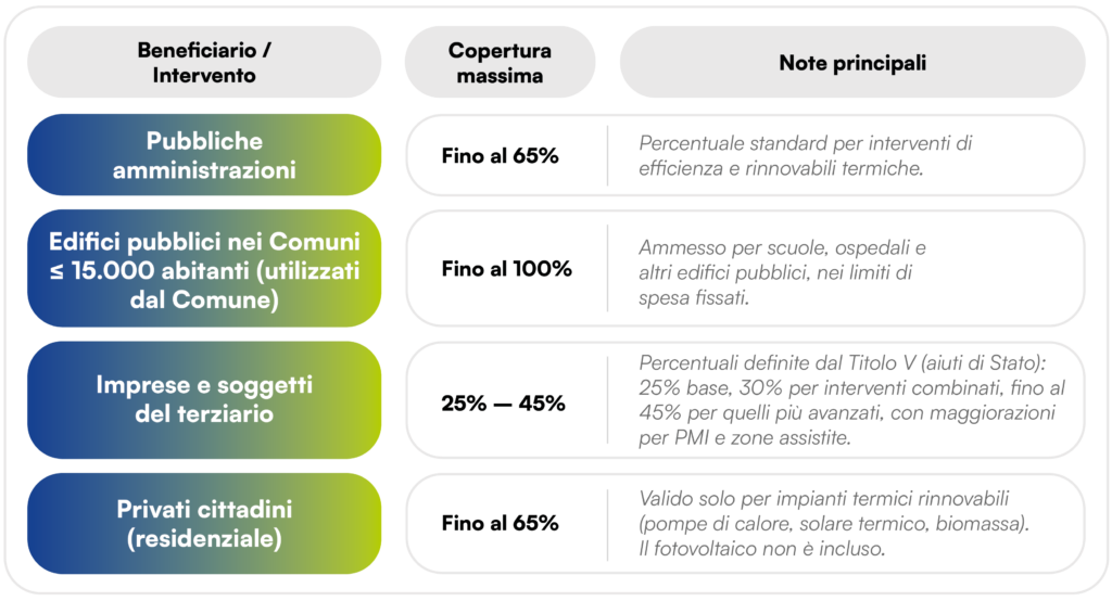 ‼️ Nota importante: Comunità Energetiche Rinnovabili (CER) e configurazioni di autoconsumo (AUC) non sono un “beneficiario” distinto. PA e privati possono avvalersi di tali configurazioni per presentare domanda, nei limiti del decreto.